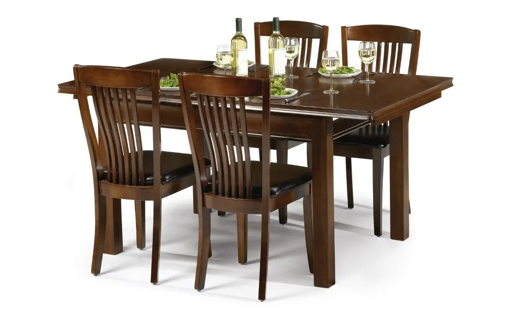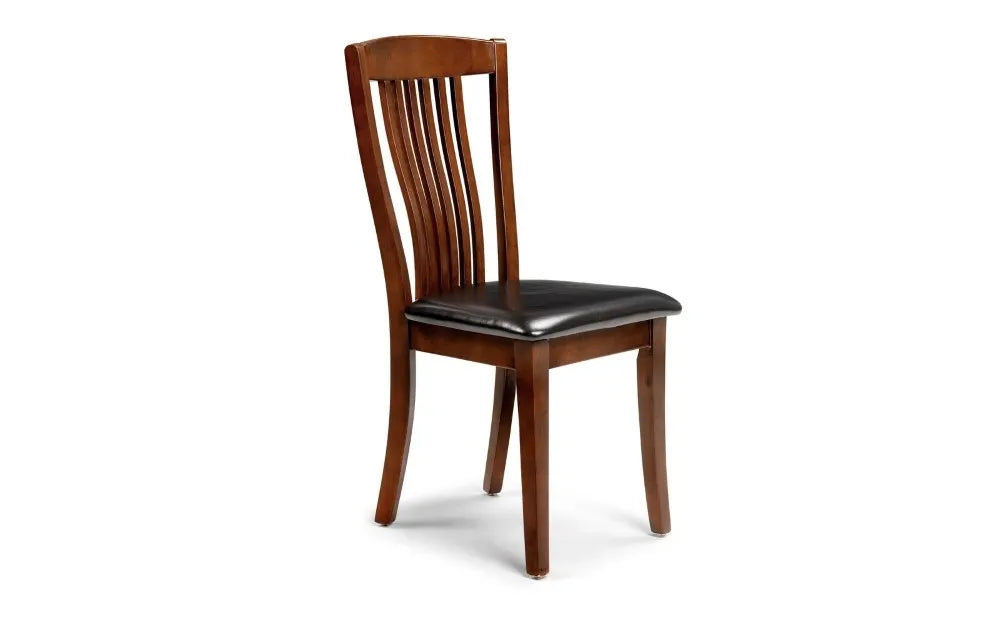 A traditional styled dining chair in a beautiful mahogany finish with a comfortable brown faux leather, padded seat. With a shaped back to add extra comfort for your posture.