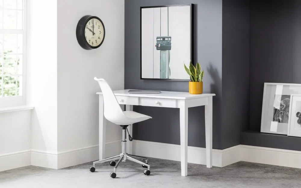 Finished in a crisp white lacquer, the free-standing Carrington Desk has a simple, yet stylish look. Featuring two drawers with rounded handles for storing all your stationery essentials, the Carrington Desk offers a compact design suitable for a range of décor.