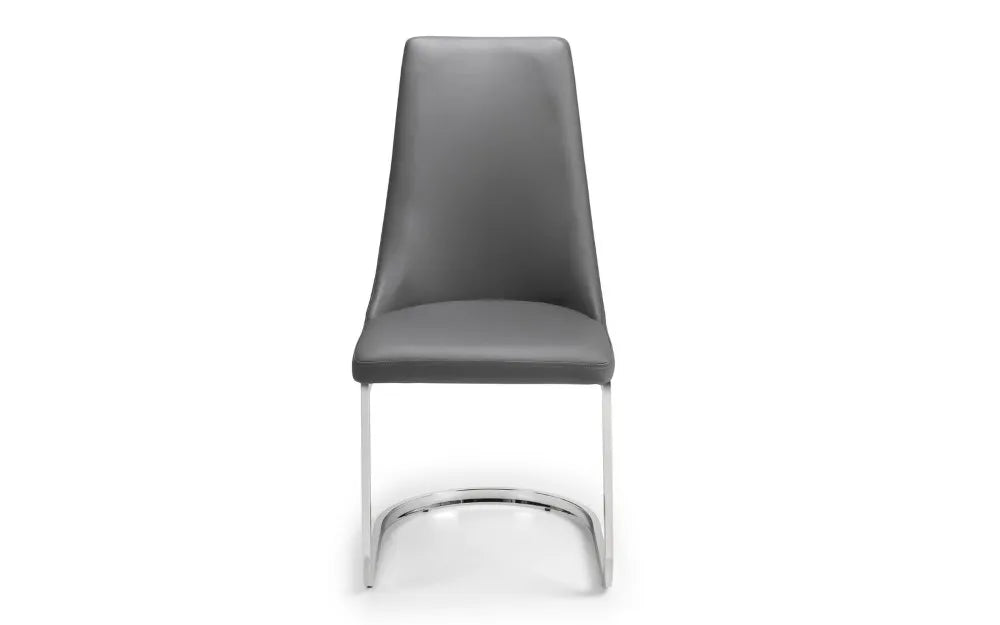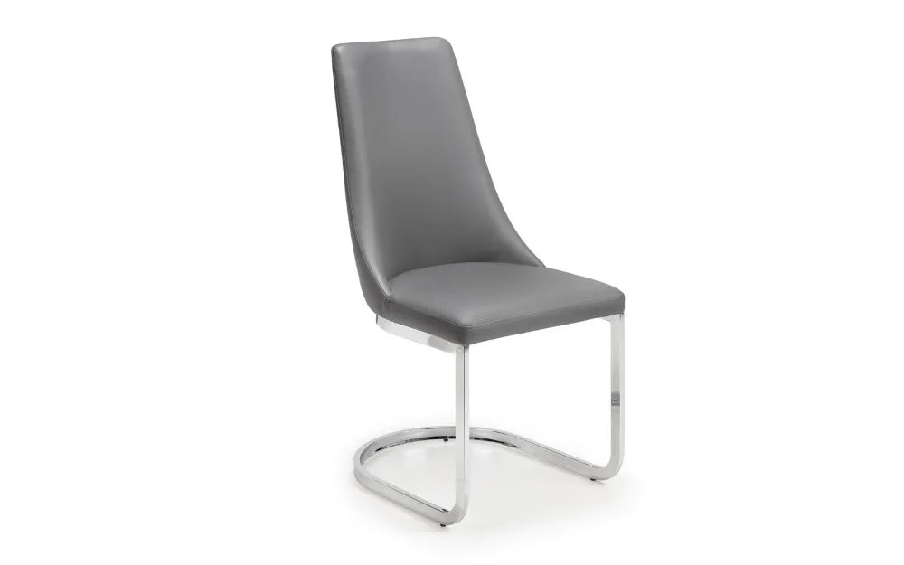 Upholstered in a grey faux leather, the Como Cantilever dining chair offers luxurious comfort. Featuring a chrome curved base, this chair adds class and sophistication to any dining room décor. Simply pair with the Como Extending Dining Table for a sleek, modern look.