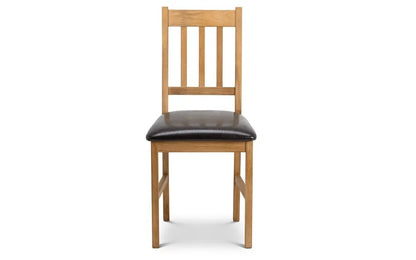 Coxmoor chairs, crafted from solid oak, with a durable oil finish and faux brown leather seats, matching almost any décor. This classic, timeless design adds extra comfort for you to enjoy your daily meals.