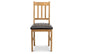 - Solid White Oak Dining Chairs in a durable oiled finish and featuring a padded brown faux leather seat.