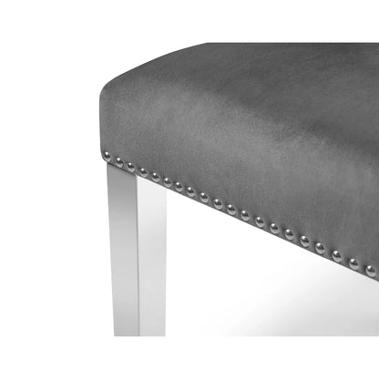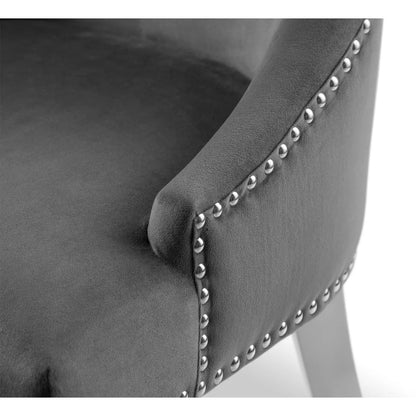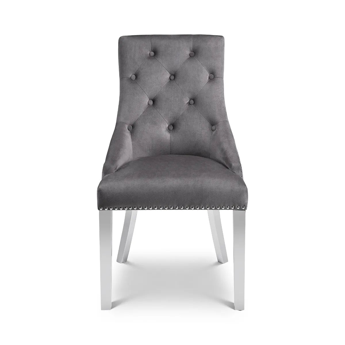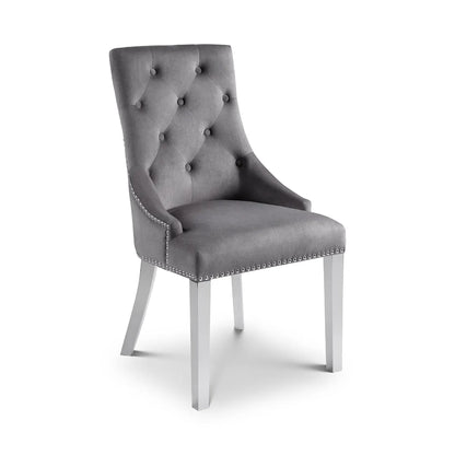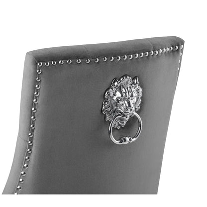 The Gladstone Lion Head Chair is an elegant buttoned-back chair, with a beautiful grey velvet finish. The contrasting chrome legs provide an inviting and classic look. Featuring a lion head handle detail on the back.