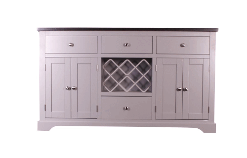 The granite worktop provides a long-lasting and robust surface. The top can either sit centrally on the base or with a 19cm overhang on one side, for use as a breakfast bar. Three drawers at the top are open on one side. One drawer placed centrally at the bottom opens on one side. Two large cupboards, opening with double doors and accessible from both sides. Each cupboard has a removable shelf, which can be set at 3 levels, or removed completely, offering versatile storage options.