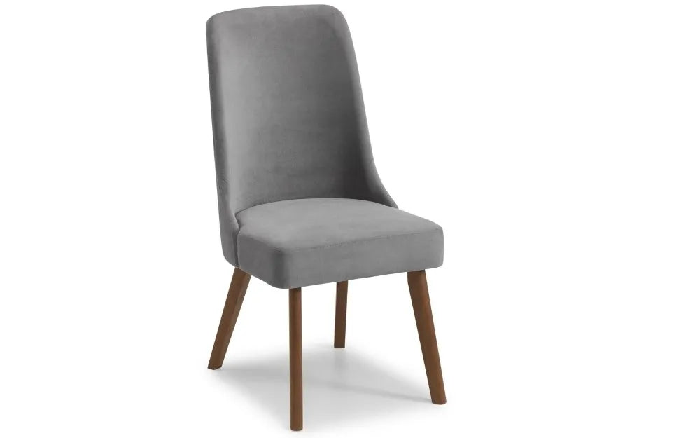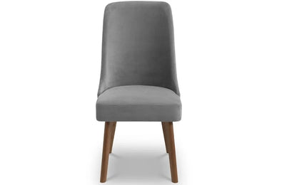 The Huxley Dining Chair features a glamourous curved back, with modern tapered walnut legs. Finished in dusk grey chenille fabric, this dining chair adds a touch of elegance to any dining area, the perfect match for the Huxley Round Table.