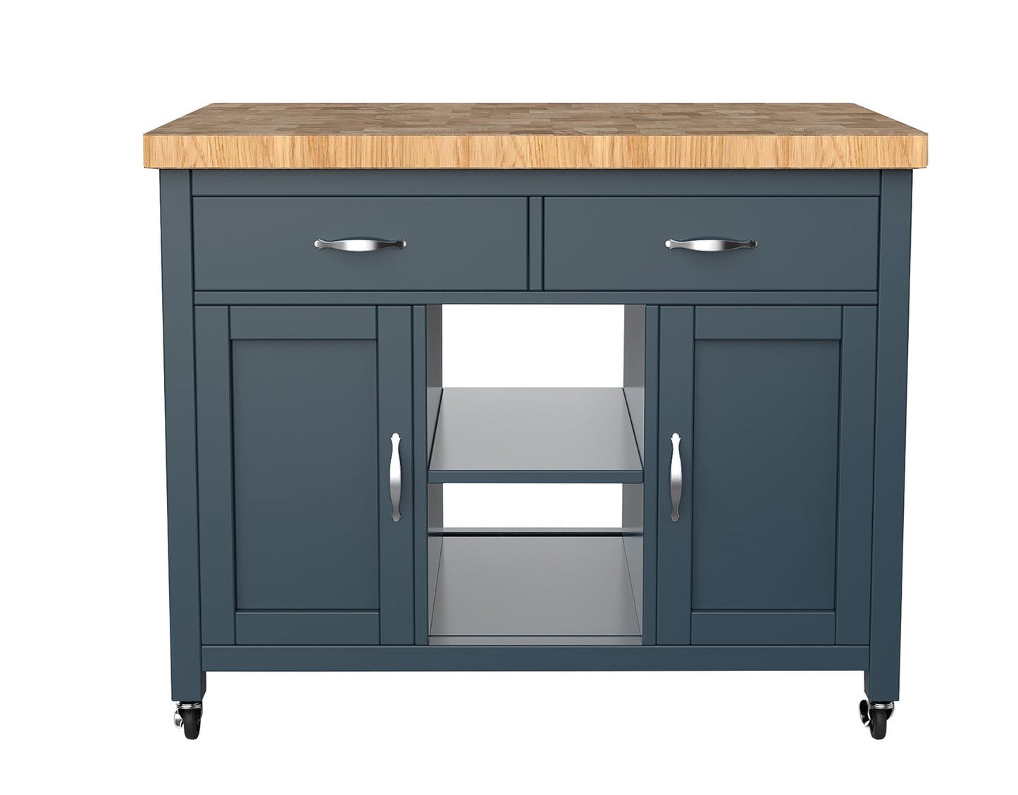 Transform your kitchen with this stylish island that combines symmetry and functionality into one. With a sturdy butcher's block top, braked wheels, drawers that extend through the island, and spacious storage cupboards, this island is a must-have for any home cook. Enjoy the convenience and added space for meal prep and storage that this island brings to your kitchen.