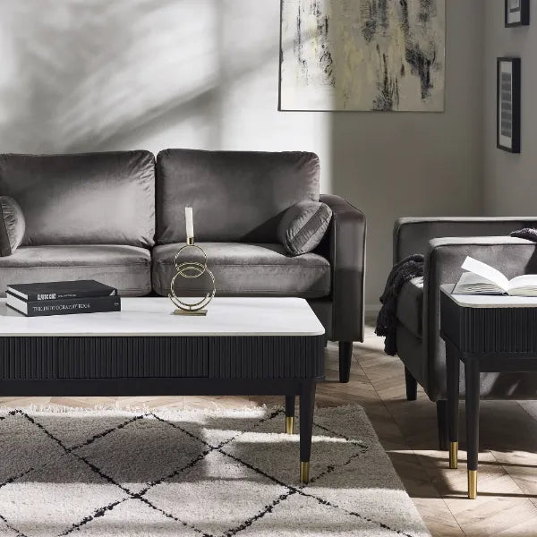 Step into luxury with the Louis Fluted Stone Top Coffee Table With 2 Drawers in Black, an enchanting addition to your living space. The captivating white stone marble effect table top with chic matt black ribbed edging exudes timeless sophistication.