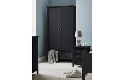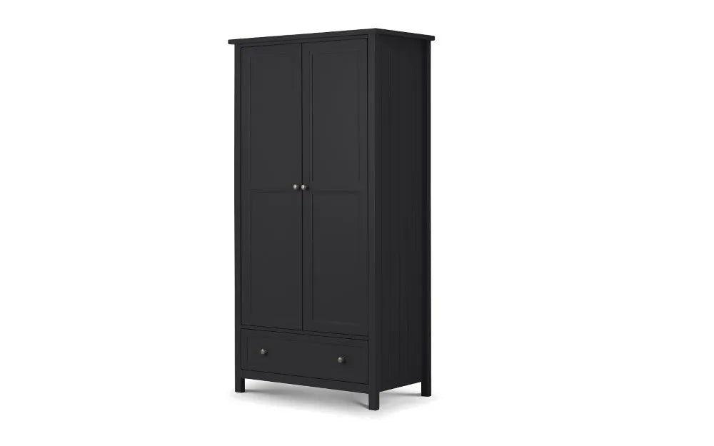 An elegant New England style wardrobe with two doors and one drawer. The combination of exquisite anthracite lacquered finish with characteristic side panelling and detailed chamfered cabinetry makes for a soothing and refined aesthetic with timeless appeal, while delicate pewter handles add the perfect finishing touch.