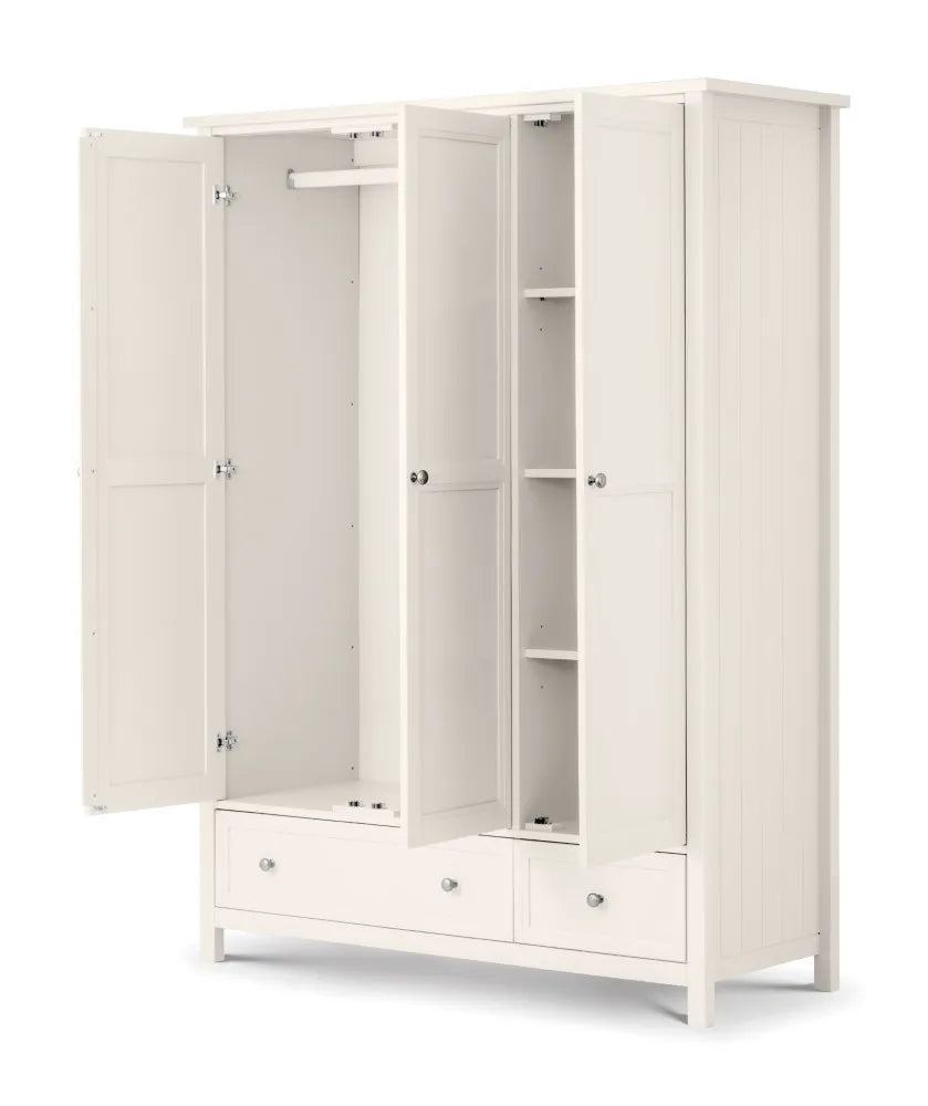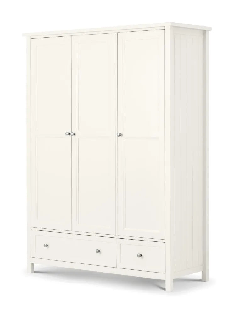 An elegant New England style wardrobe with three doors and two drawers. The combination of exquisite surf white lacquered finish with characteristic side panelling and detailed chamfered cabinetry makes for a soothing and refined aesthetic with timeless appeal, while delicate pewter handles add the perfect finishing touch.