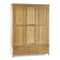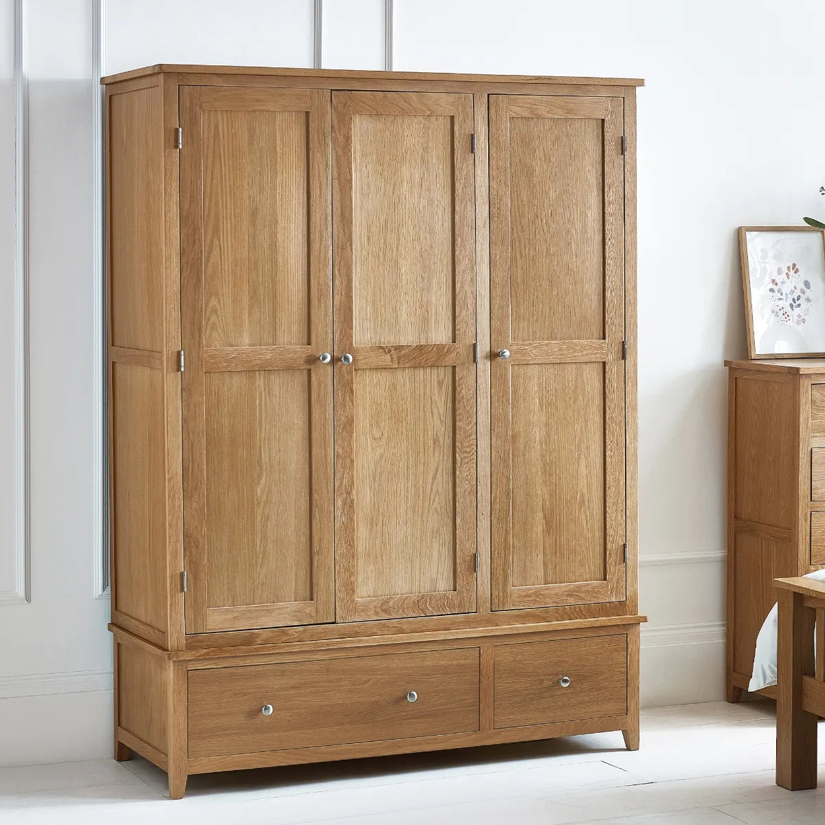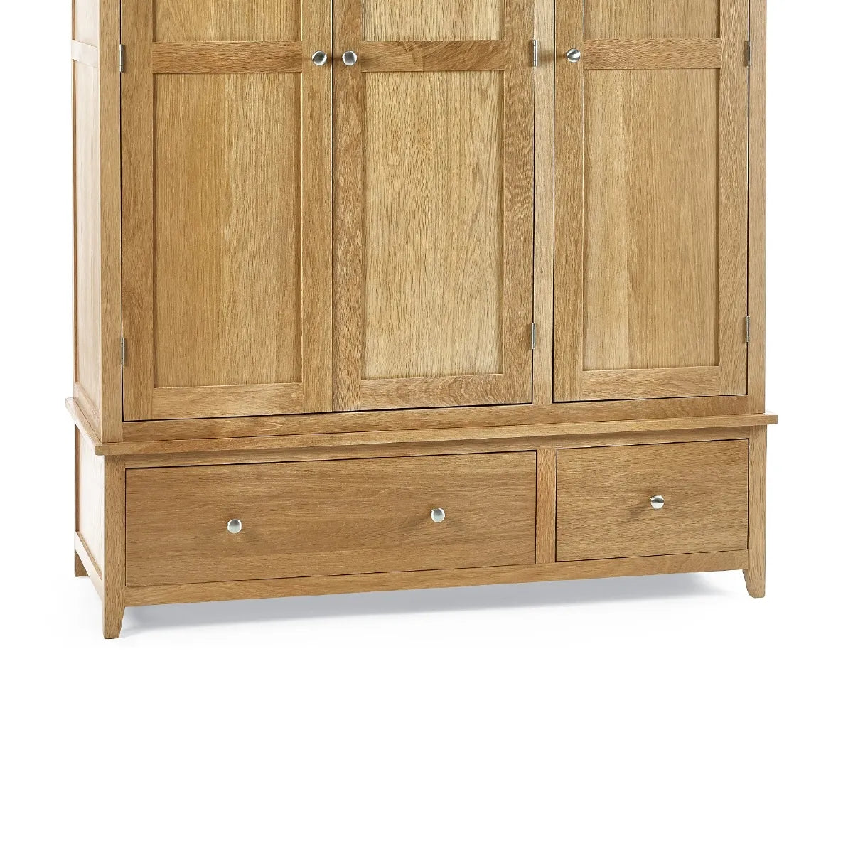Crafted from solid oak and oak veneers the Mallory 3 Door Wardrobe ensures style and lasting durability. Featuring a spacious 3 door design with 2 drawers, this wardrobe provides plenty of storage for clothing. Finished with round silver knobs, perfect for any bedroom space.