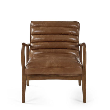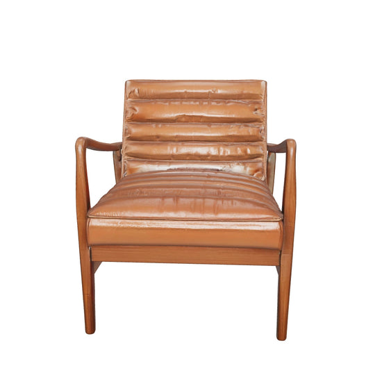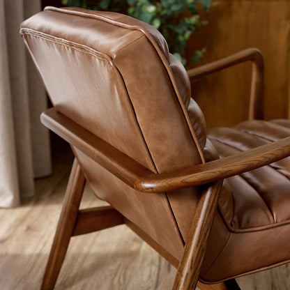 Bring timeless charm to your space with the Marshall Accent Chair in Brown. Crafted with a solid wood frame that showcases natural beauty, it pairs durability with sleek design. The ribbed cushioned seat, upholstered in smooth vintage brown leather, offers exceptional comfort and a retro-inspired look. Whether enhancing a cosy corner or anchoring your decor, it makes an inviting and stylish addition to any room.