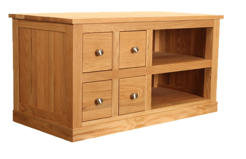 There are two open shelves designed to hold DVD players and Skybox and both of the open shelves have cable holes to the rear to allow invisible wiring. The four drawers are designed to store CDs and DVDs and hold approximately 116 standard CDs or 36 DVDs.