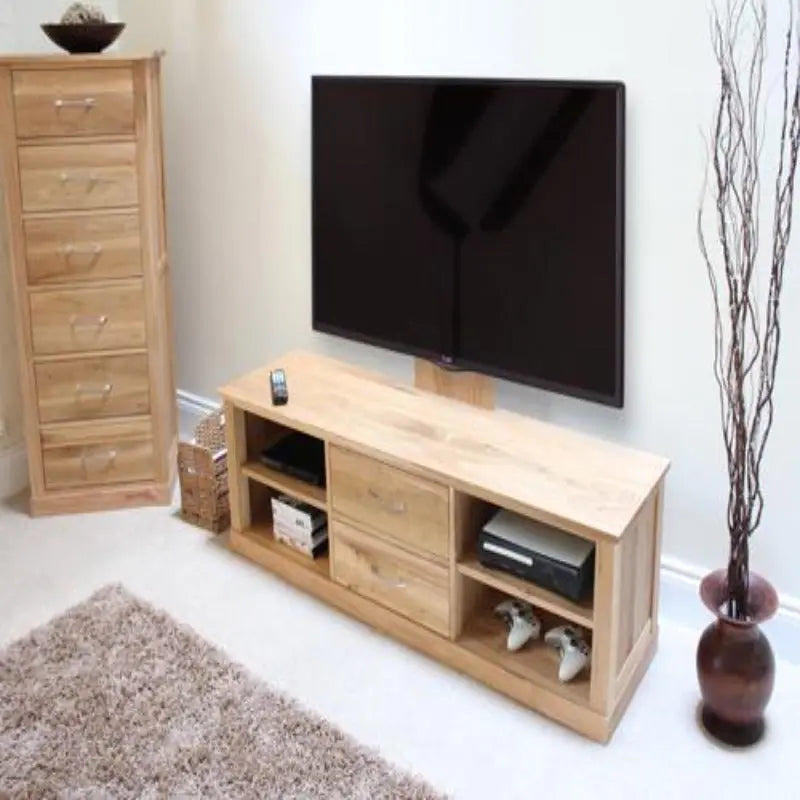 There are cable holes in the rear to allow for invisible wiring. This unit is crafted from the highest grade, selected solid oak. No veneers. The TV cabinet is fitted with stylish brushed steel two-tone handles and finished with a resilient satin lacquer finish is hardwearing yet emphasises the beautiful oak grain.