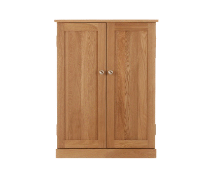 This superb contemporary oak shoe cupboard has four shoe shelves, and an accessories shelf designed for hats, gloves and sunglasses. Crafted from the highest grade, selected solid oak. No veneers. Complete with stylish brushed steel knobs. Finished in a resilient satin lacquer finish and has exceptional build quality throughout.