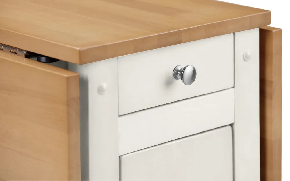 - The set features a handy integrated storage drawer and is finished in a Low Sheen White and Natural Lacquered Finish.