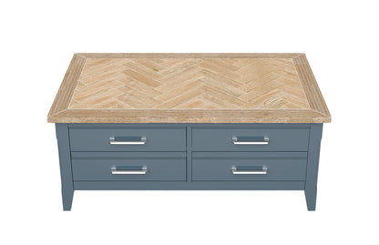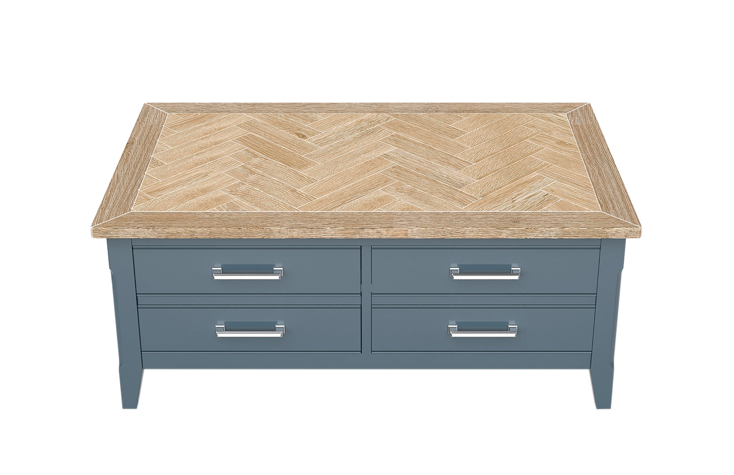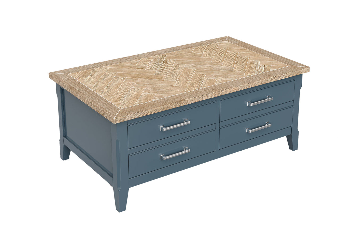 The Signature Blue Coffee Table With Drawers & Hidden Storage Trunk features meticulous craftsmanship in the hand-finishing process. The oak parquet top undergoes a delicate distressing, followed by the application of a thin layer of white paint that is meticulously hand-rubbed back. The final touch involves a resilient clear lacquer, resulting in a breathtaking and durable appearance. Features four drawers and a hidden storage trunk, This is a high-end collection, designed to last a lifetime.