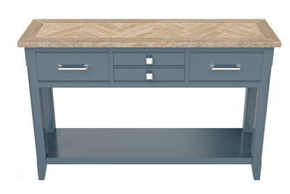 The Signature Blue - Console Table features meticulous craftsmanship in the hand-finishing process. The oak parquet top undergoes a delicate distressing, followed by the application of a thin layer of white paint that is meticulously hand-rubbed back. The final touch involves a resilient clear lacquer, resulting in a breathtaking and durable appearance. Features two large drawers and two small drawers.