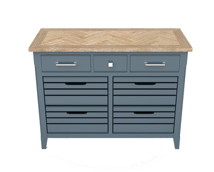 The Signature Blue Sideboard / Servery features meticulous craftsmanship in the hand-finishing process. The oak parquet top undergoes a delicate distressing, followed by the application of a thin layer of white paint that is meticulously hand-rubbed back. The final touch involves a resilient clear lacquer, resulting in a breath-taking and durable appearance. Features three small drawers, and four large 'crate' styled drawers