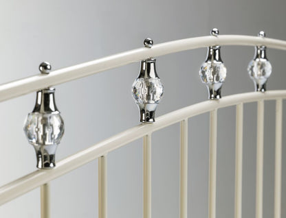 Sophie is a truly glamorous bed, exquisitely finished in stone white and featuring luxurious crystal effect finials and smart chrome detailing for a stunning overall effect. A sprung slatted base ensures extra comfort and a prolonged mattress life.