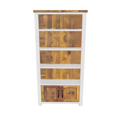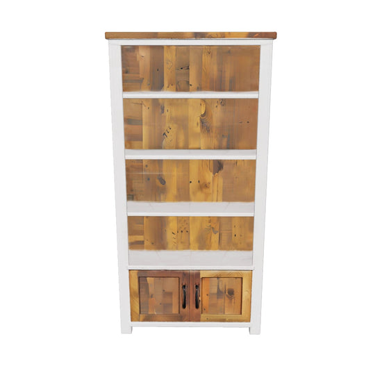 Our stunning Splash of White - Large Open Bookcase With Doors boasts an exceptional commitment to sustainability, all external timbers used are 100% reclaimed, helping us to contribute to a greener, more beautiful world. Features a cupboard and four fixed shelves.