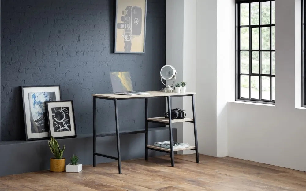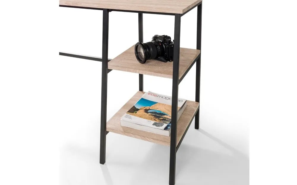 A cool, modern desk designed to add a contemporary touch to any living space. Its simple clean lines, delineated by a subtle, black-coated metal frame are complemented perfectly by a warm, Sonoma oak foil, to create a very stylish and sleek product. This desk features 2 shelves on the right-hand side, suitable for stationary storage.