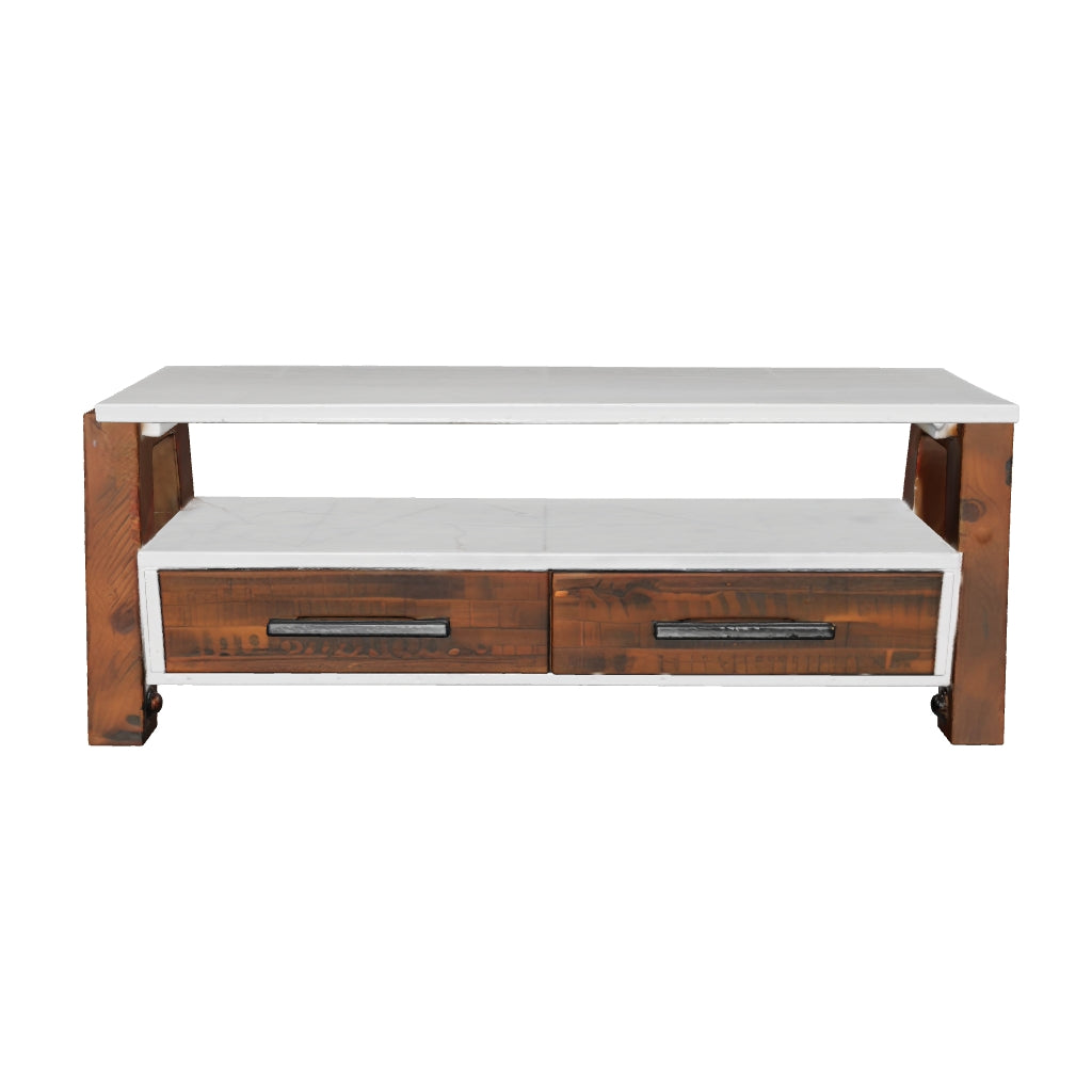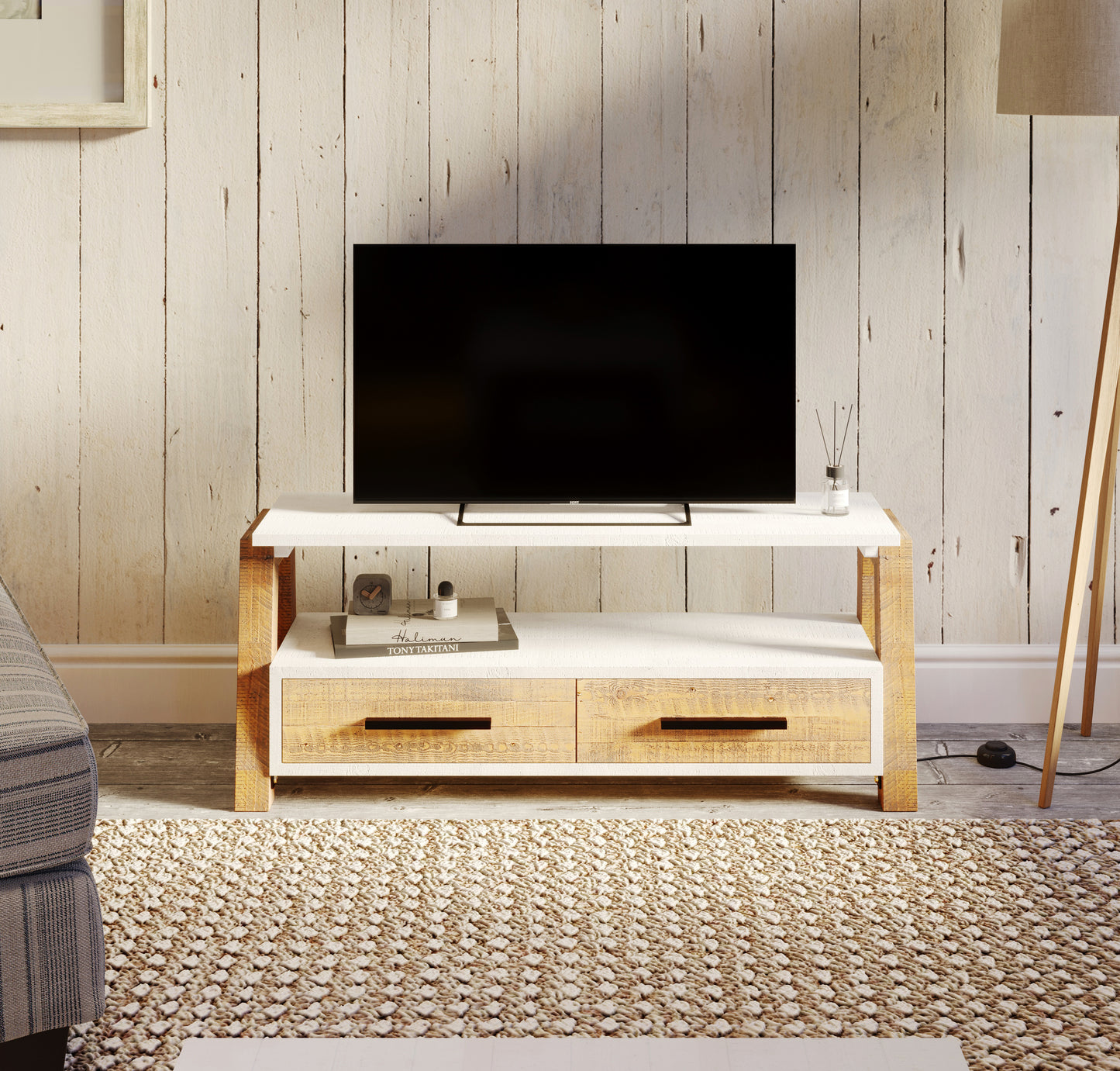 Our stunning scandic-themed Trinity - Reclaimed Television Cabinet boasts an exceptional commitment to sustainability, all external timbers used are 100% reclaimed, helping us to contribute to a greener, more beautiful world. Ideal for televisions with a screen size up to 60". Features two drawers and opening for ancillaries.