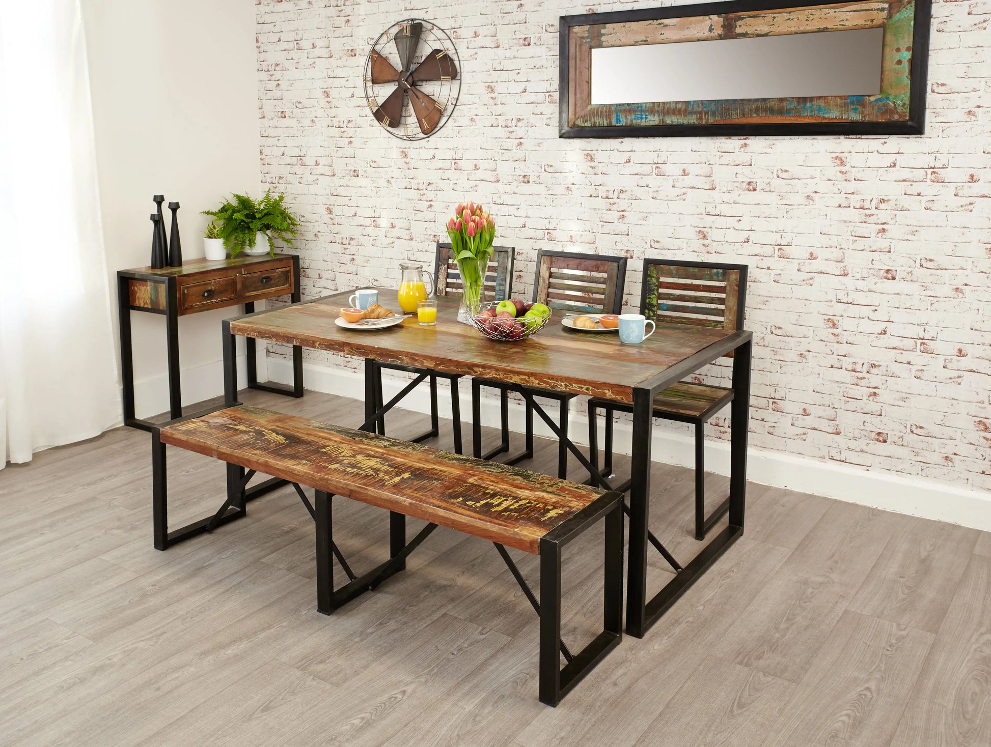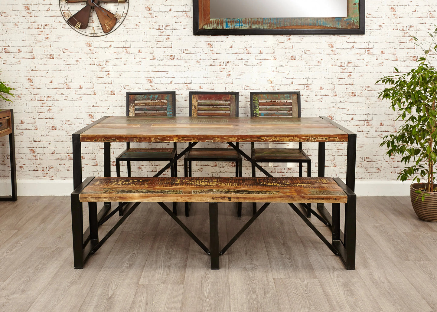 Discover the Urban Chic Collection, crafted from reclaimed wood salvaged from regions like Gujarat, Maharashtra, and Rajasthan in India. The wood, aged between 50 and 150 years, is paired with dark steel frames to create a unique urban aesthetic.