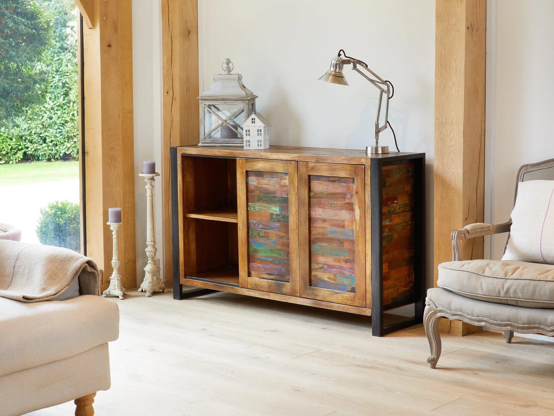 The exclusive Urban Chic range uses reclaimed wood from Gujarat, Maharashtra, and Rajasthan in Southern India, making each piece truly one-of-a-kind. Crafted by skilled artisans and finished with a blend of reclaimed timbers, this vibrant and colorful furniture is assembled for optimal durability. The steel outer frame adds an urban edge and structural strength to this beautifully crafted unit.