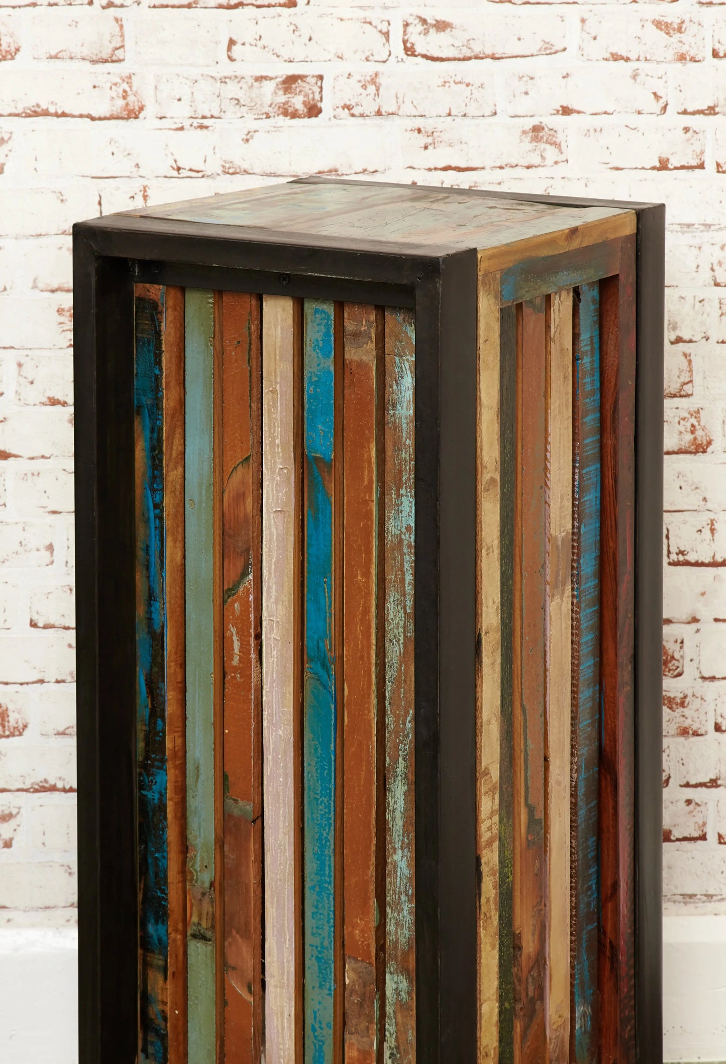 Discover a unique and contemporary addition to your home with our tall slatted plant stand/lamp table from the Urban Chic collection. Skillfully crafted with reclaimed wood from locations like Gujarat, Maharashtra, and Rajasthan in Southern India, this piece features slatted sides for a solid appearance and colorful character.