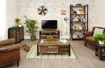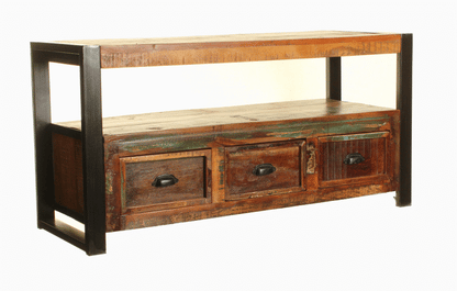 The exclusive Urban Chic range is expertly crafted from reclaimed wood sourced in Gujarat, Maharashtra, and Rajasthan in Southern India, with some pieces dating back as far as 50-150 years. Skilled craftsmen assemble the furniture, creating a vibrant and colorful design. Each piece is truly one-of-a-kind, as the hand-finished reclaimed timbers are blended together in a unique way. Adding to the urban appeal and structural strength is a beautifully crafted steel outer frame.