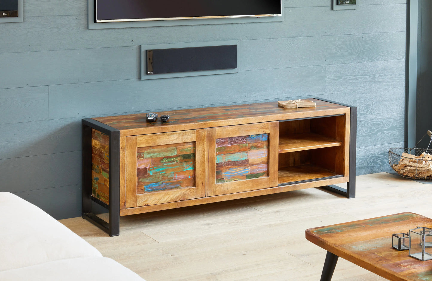 The sliding doors add a unique touch, allowing you to display or hide parts of the unit as desired. Crafted from reclaimed wood from Southern India, each piece is individually hand-finished, making it truly one-of-a-kind. A steel outer frame adds an urban edge and durability, while the resilient satin lacquer highlights the natural beauty of the aged wood. Experience exceptional quality and style that will last a lifetime.