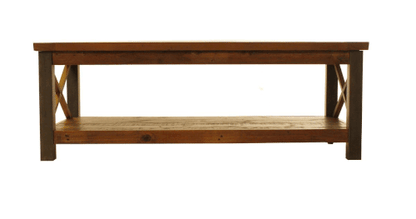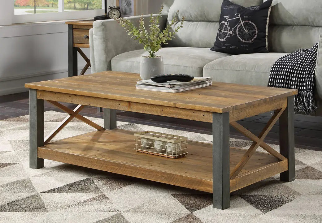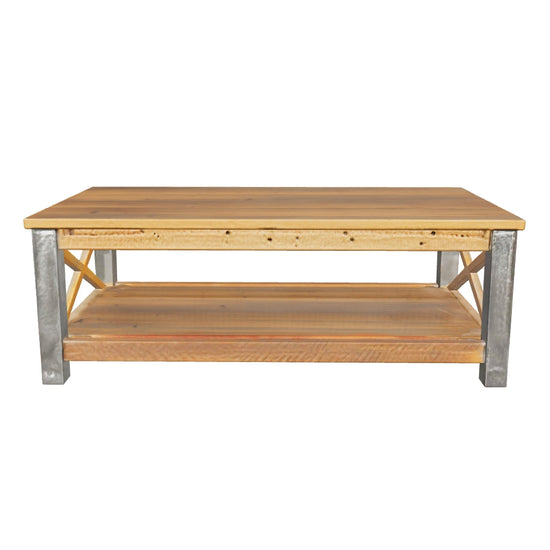 Add charm and function to your living room with this Urban Elegance Reclaimed Coffee Table. The sturdy and versatile range combines rustic charm with an industrial edge. Each piece is uniquely crafted using reclaimed timbers and hand-finished for a one-of-a-kind look. The powder-coated steel frame features a stylish cross design and complements the solid rough-sawn wood. A resilient satin lacquer finish showcases the natural imperfections of the timber.