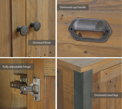The distressed, powder-coated steel frame ensures an attractive matt finish, which combines beautifully with the solid reclaimed rough-sawn wood. Featuring a stylish cross design in the frame, these pieces will be a focal point in any room.