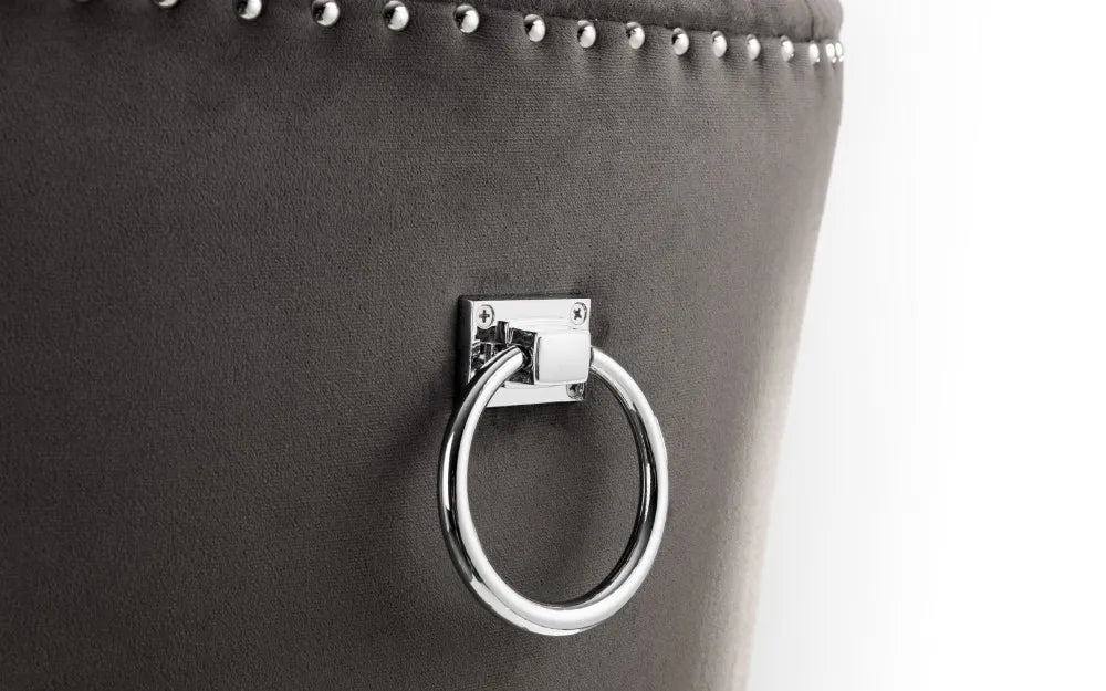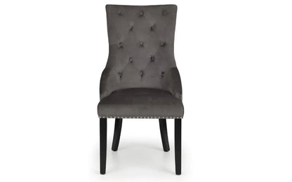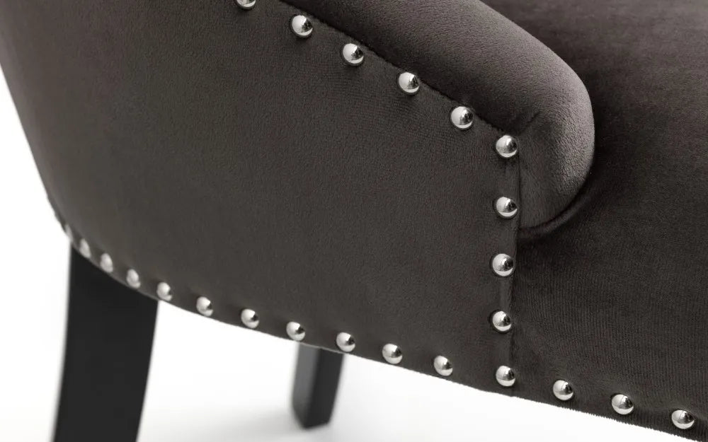 Upholstered in a soft touch luxurious grey velvet fabric, the Veneto Knockerback chair has a metal ring detail on the back along with glamourous deep buttoning and a metal stud trim. Finished with sturdy black lacquered legs, this chair is perfect as a statement standalone or as part of a dining set