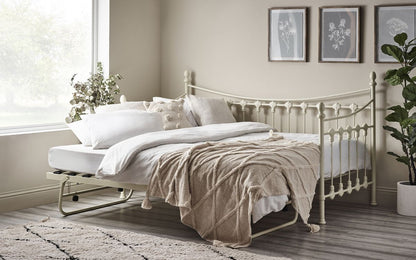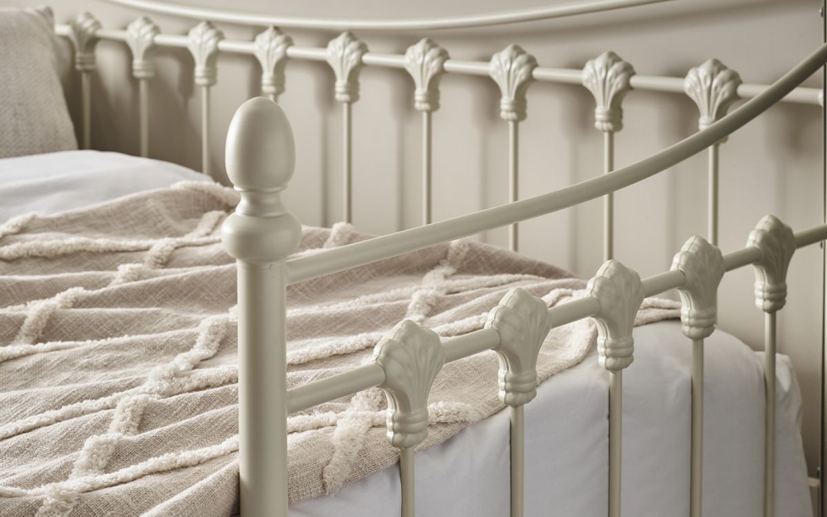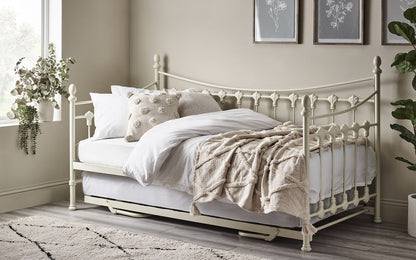 An elegant interpretation of a great classic design offering a full 90cm sleeping or sitting space. Finished in a stone white eggshell textured lacquer and incorporating a sprung slatted base for aded comfort and prolonged mattress life. Versailles is a beautiful daybed that fits beautifully in any setting, from living room to conservatory, as a functional guest bed and even as a charming children's bed.