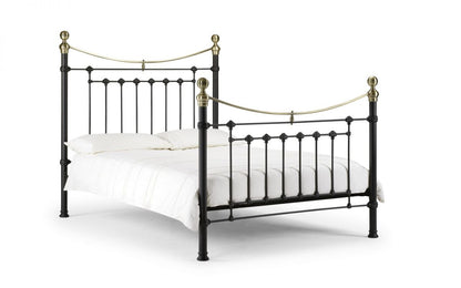 This is a traditional, Victorian-inspired bedstead with attractive brass embellishments in a powder-coated steel satin black finish. The Victoria is an imposing bed with a striking high headboard and matching footboard, whose timeless style complements a wide range of interior styles. A sprung slatted base ensures a comfortable night's sleep and prolonged mattress life. Available in 90cm, 135cm and 150cm sizes.